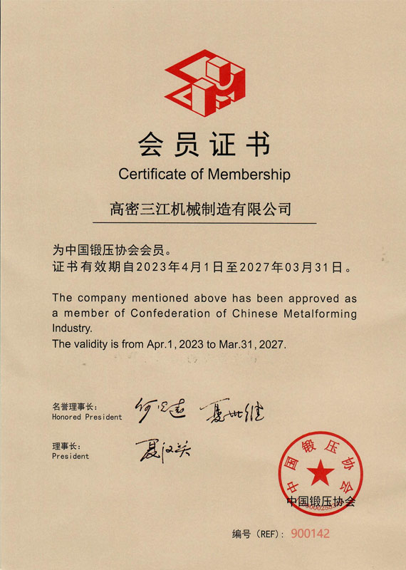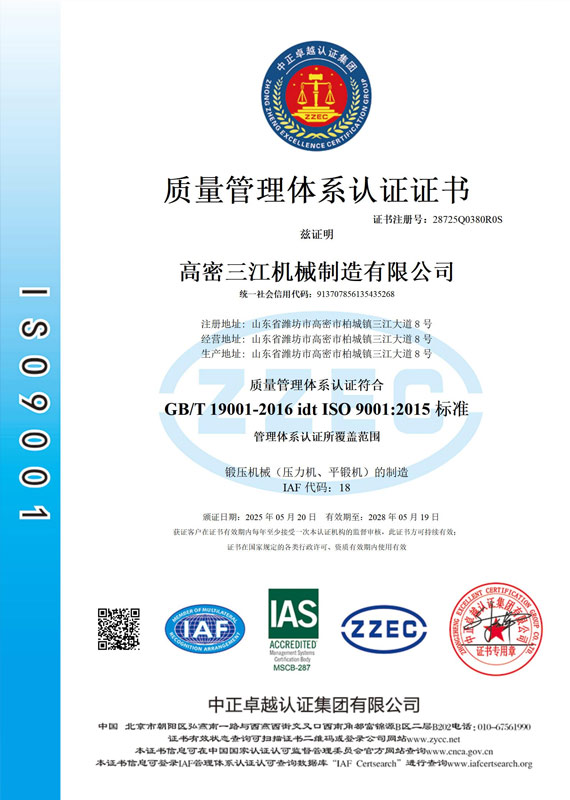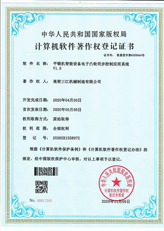 三江机械“以创新求发展”,注重知识产权申请和保护,近年来已获得国家高新技术企业和山东省“专精特新”企业,拥有ISO9001质量管理体系认证和欧盟CE认证。公司注重研发创新,共引进国内先进技术成果3项,取得发明专利5项,实用新型专利30余项,软件著作权5项。先后与南京航空航天大学、山东理工大学、青岛科技大学等高校在金属成形工艺和新材料应用等领域展开合作。